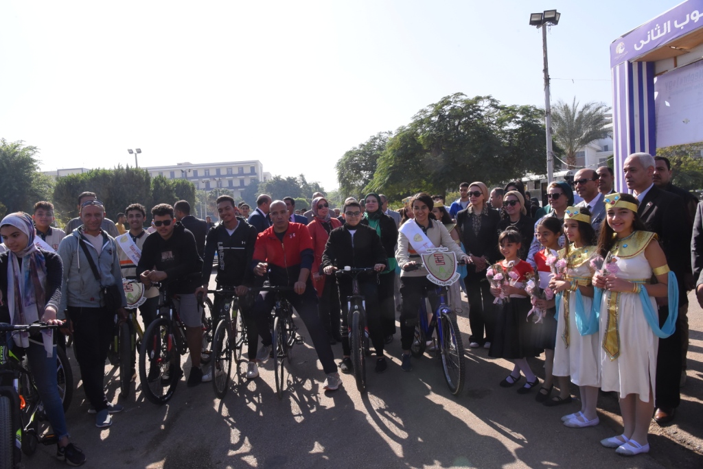 Dr. Maha Ghanem stated that the celebration began with the launch of the University President for a cycling race. Many university students, as well as several students from Al-Salam Schools, Smart City and Integrated Care Schools participated in the race. Following the race was the opening of the Environmental Activities Exhibition, which included in its entirety exhibits dealing with various environmental challenges. On the top of these challenges: climate change and the problems it causes to the environment and how to confront it, pollution and how to fight it, and ways to preserve natural resources for future generations. This was done through posters for the research of students of various faculties and models of environmentally friendly green projects that they presented.