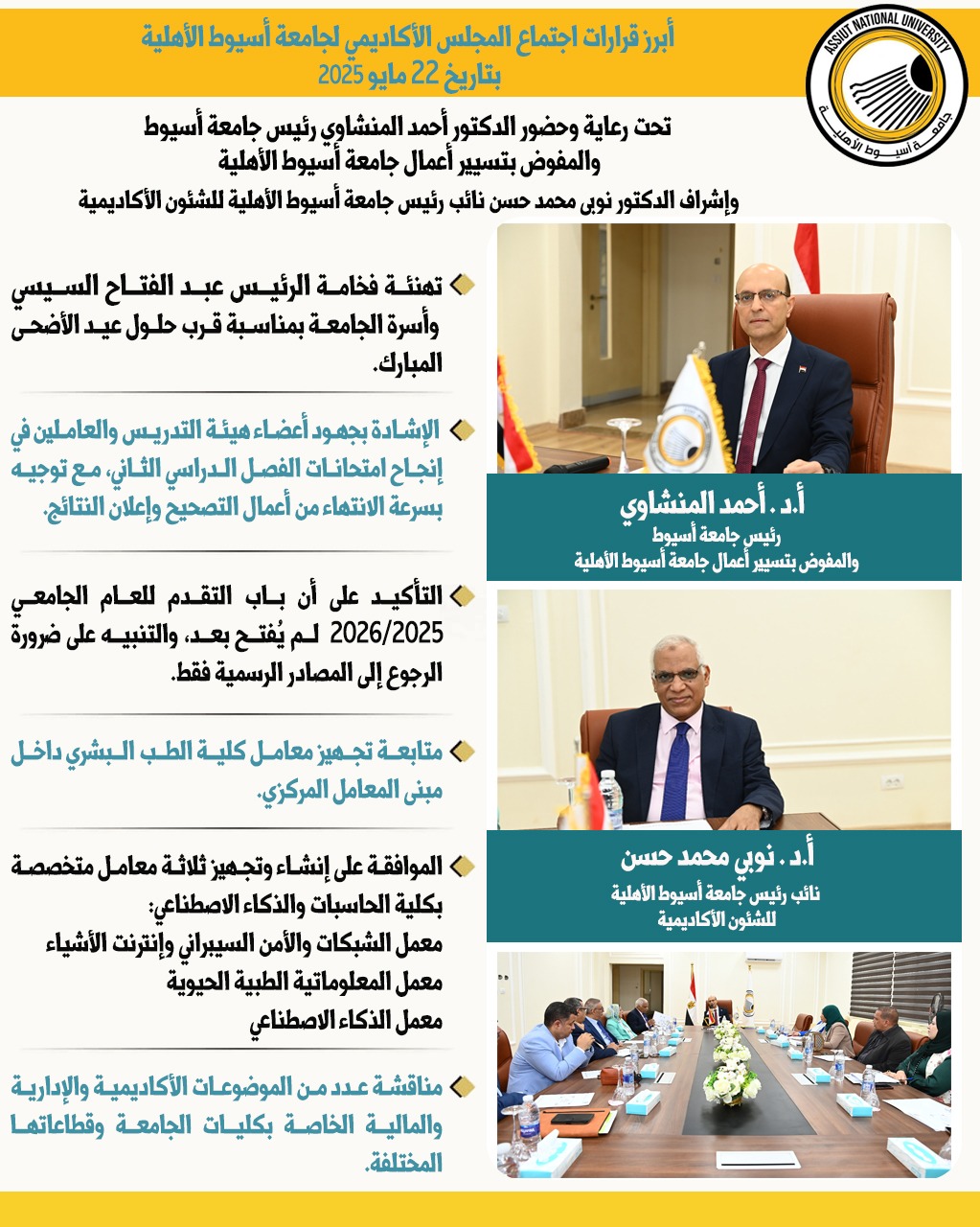 أبرز قرارات اجتماع المجلس الأكاديمي لجامعة أسيوط الأهلية بتاريخ 22 مايو 2025، تحت رعاية وحضور الدكتور أحمد المنشاوي رئيس جامعة أسيوط والمفوض بتسيير أعمال جامعة أسيوط الأهلية، وإشراف الدكتور نوبي محمد حسن نائب رئيس جامعة أسيوط الأهلية للشئون الأكاديمية.