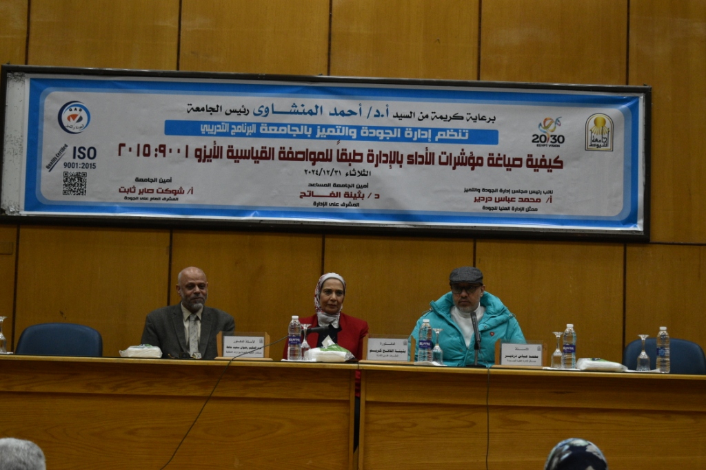 برعاية الدكتور أحمد المنشاوي، رئيس جامعة أسيوط، نظّمت إدارة الجودة والتميز بالجامعة، اليوم الثلاثاء الموافق ٣١ من ديسمبر، فعاليات البرنامج التدريبي؛ حول: "كيفية صياغة مؤشرات الأداء بالإدارة طبقاً للمواصفة القياسية الأيزو ٩٠٠١: ٢٠١٥"، تحت إشراف الأستاذ شوكت صابر أمين عام الجامعة، وذلك بقاعة المناقشات (١) بالمبني الإداري جامعة أسيوط.