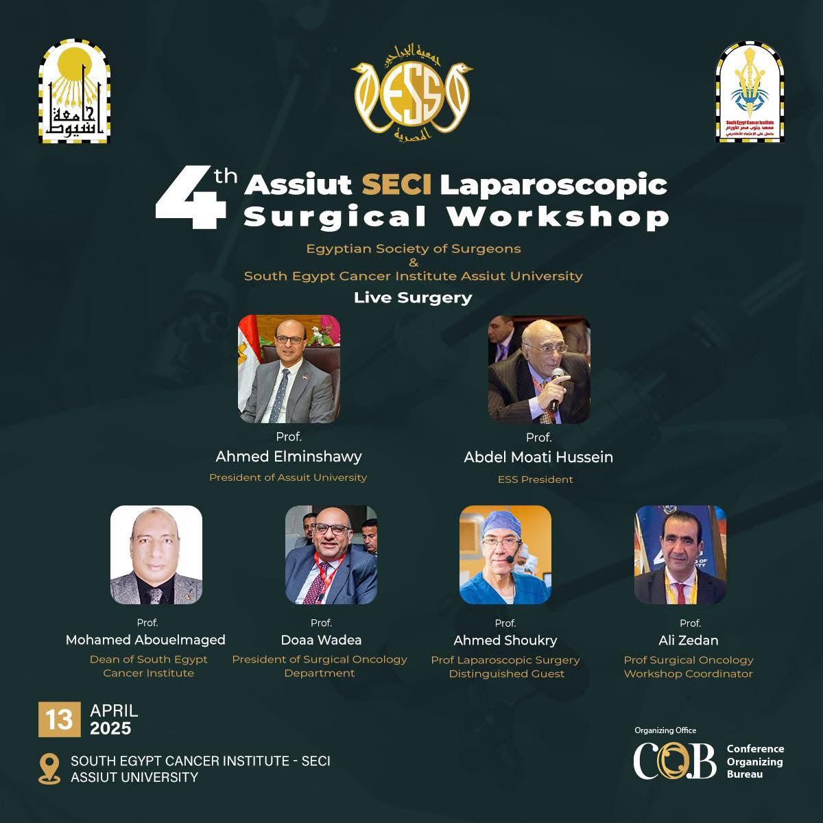 وتُعقد الورشة تحت إشراف: الدكتور محمد أبو المجد، عميد معهد جنوب مصر للأورام، الدكتورة دعاء وديع مكسيموس، رئيس قسم جراحة الأورام بالمعهد، والدكتور علي زيدان، أستاذ جراحات المناظير والأورام، والمنسق العام للورشة