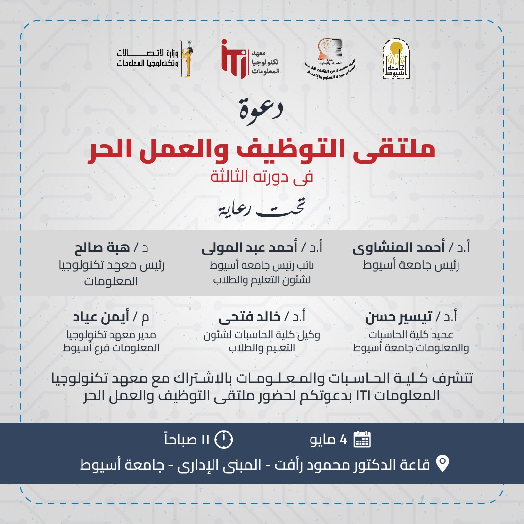 أعلن الدكتور أحمد المنشاوي، رئيس جامعة أسيوط، عن انطلاق فعاليات ملتقى التوظيف والعمل الحر في دورته الثالثة، والذي تنظمه كلية الحاسبات والمعلومات بالتعاون مع معهد تكنولوجيا المعلومات (ITI) التابع لوزارة الاتصالات وتكنولوجيا المعلومات، وذلك يوم الأحد الموافق 4 مايو 2025، في تمام الساعة 11 صباحًا، بقاعة الدكتور محمود رأفت بالمبنى الإداري للجامعة.