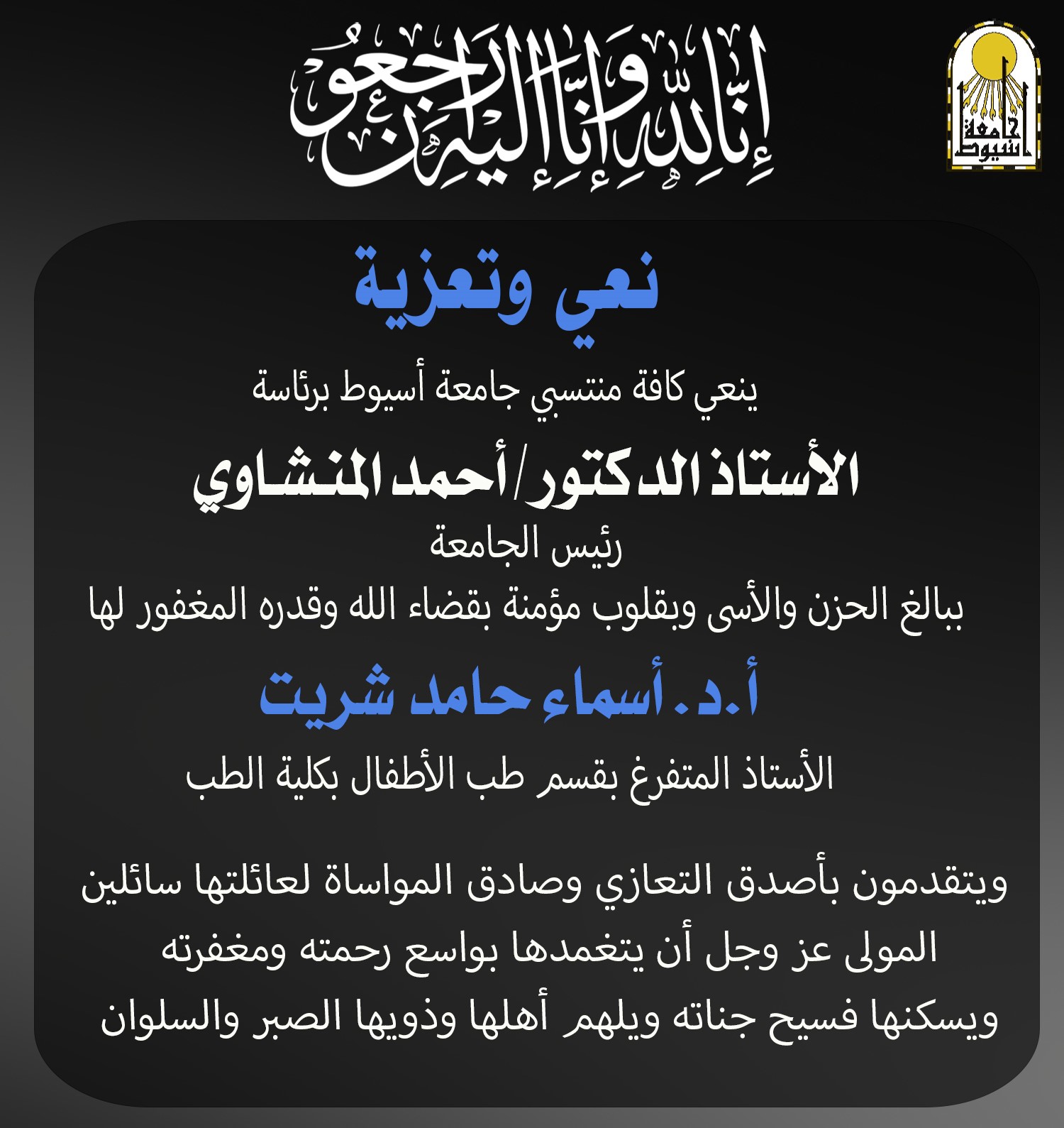 ببالغ الحزن والأسى، ينعى الأستاذ الدكتور أحمد المنشاوي، رئيس جامعة أسيوط، الأستاذة الدكتورة أسماء حامد شريت، الأستاذ المتفرغ بقسم الأطفال بكلية الطب، التي وافتها المنية.