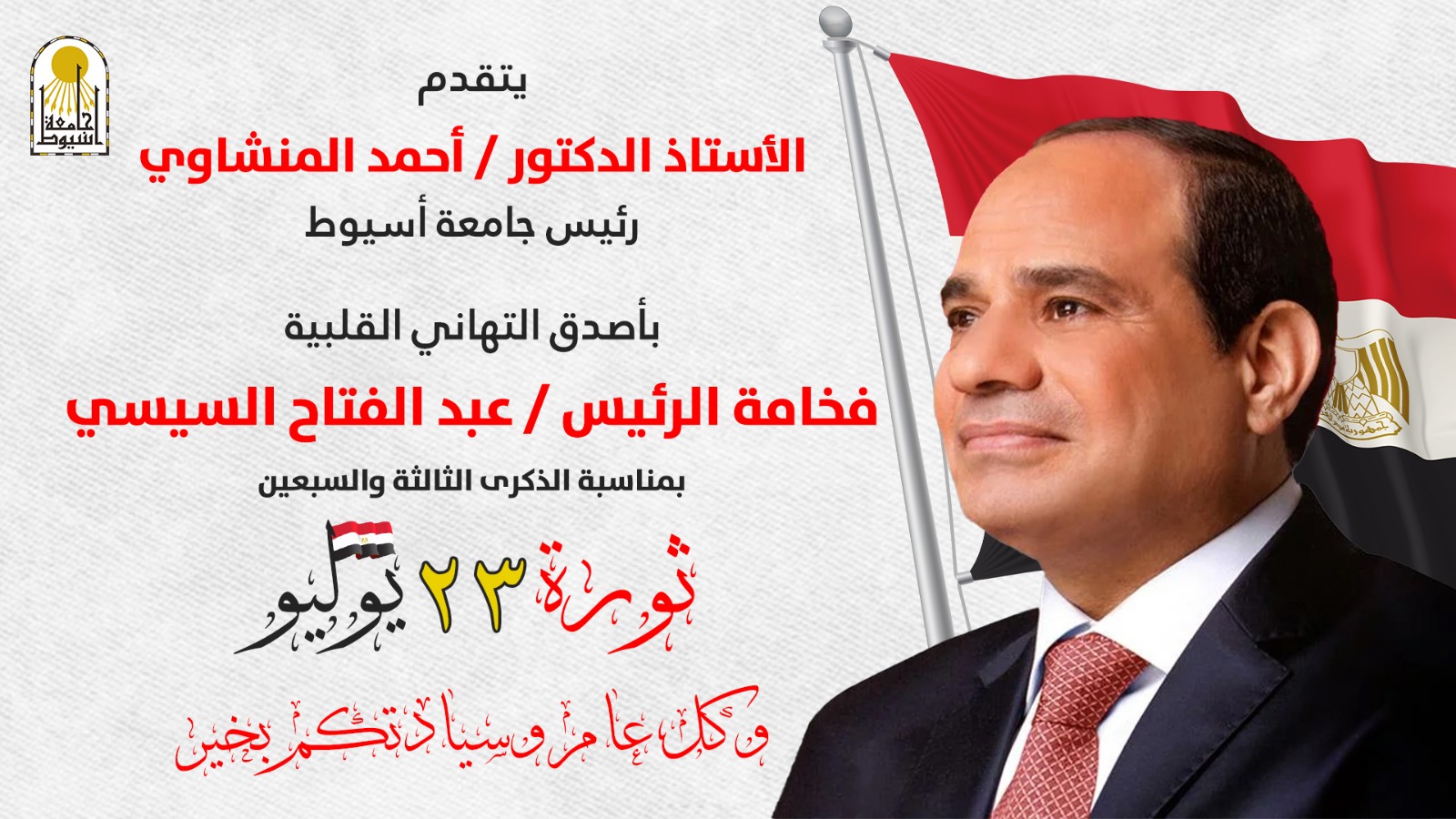 بعث الدكتور أحمد المنشاوي، رئيس جامعة أسيوط، برقية تهنئة إلى فخامة الرئيس عبد الفتاح السيسي، رئيس الجمهورية، بمناسبة حلول الذكرى الثالثة والسبعين لثورة 23 يوليو المجيدة.