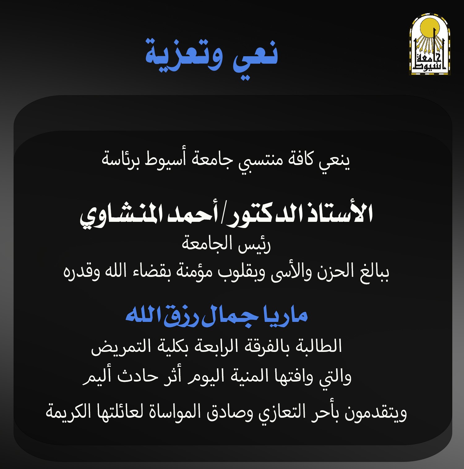 ويتقدم رئيس جامعة أسيوط، باسمه وباسم أسرة الجامعة من أعضاء هيئة التدريس والطلاب والعاملين، بخالص التعازي والمواساة لأسرة الفقيدة، سائلًا الله عز وجل أن يتغمدها بواسع رحمته، وأن يلهم أهلها وذويها الصبر والسلوان.
