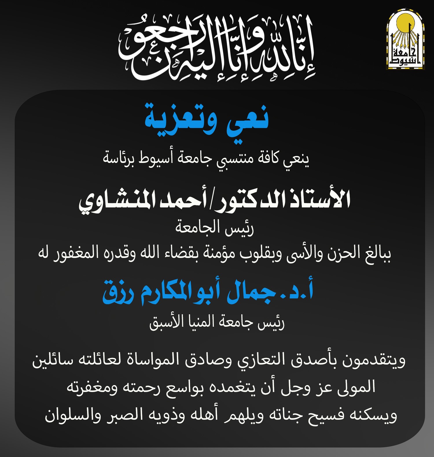 ويتقدم الأستاذ الدكتور المنشاوي، بخالص العزاء وصادق المواساة إلى جامعة المنيا، وإلى أسرة الفقيد وذويه ومحبيه وطلابه، سائلًا المولى – عز وجل – أن يتغمده بواسع رحمته، ويسكنه فسيح جناته، وأن يُلهم الجميع الصبر والسلوان.
