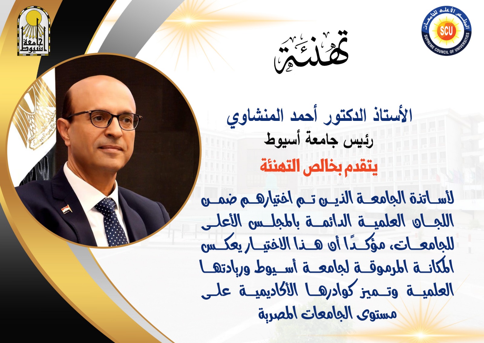 وهنأ رئيس الجامعة أعضاء هيئة التدريس الذين تم اختيارهم، مثمنًا نجاحهم في الوصول إلى هذه المكانة المتميزة، ومؤكدًا أن هذا الاختيار يجسد الثقة في كفاءاتهم العلمية وخبراتهم الأكاديمية، ويعكس ريادة جامعة أسيوط في مختلف المجالات.