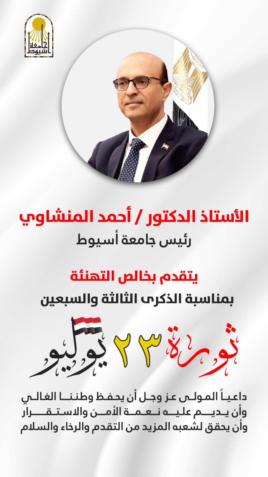 الدكتور المنشاوي يهنئ أسرة جامعة أسيوط بذكرى ثورة 23 يوليو ويؤكد مواصلة البناء في ظل الجمهورية الجديدة