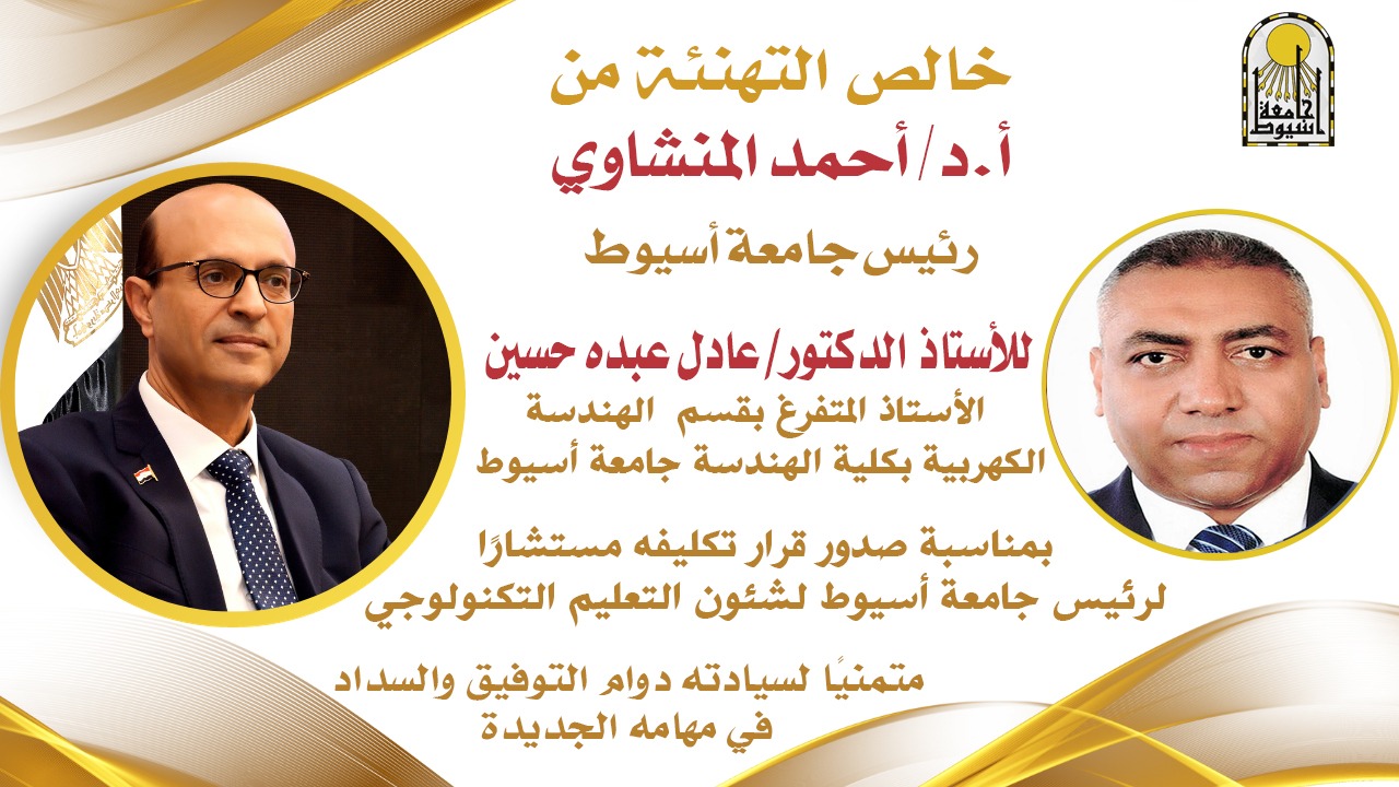 أصدر الدكتور أحمد المنشاوي، رئيس جامعة أسيوط، والمشرف على جامعة أسيوط التكنولوجية الدولية، القرار رقم (3174) لسنة 2025، بتكليف الدكتور عادل عبده حسين أحمد، الأستاذ المتفرغ بقسم الهندسة الكهربية بكلية الهندسة، للعمل مستشارًا لرئيس جامعة أسيوط لشئون التعليم التكنولوجي، وذلك اعتبارًا من تاريخ صدور القرار في 19 أغسطس 2025.