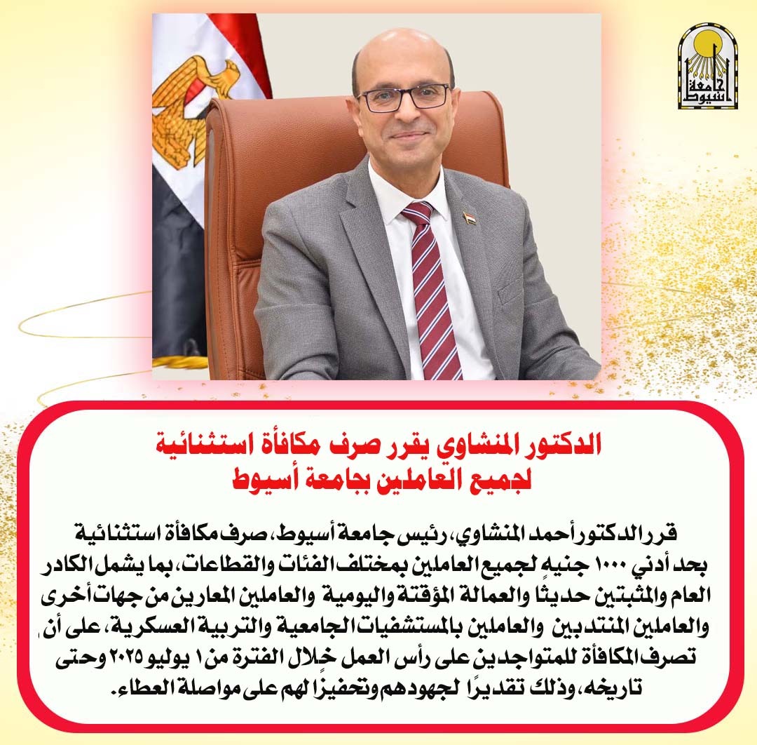 قرر الدكتور أحمد المنشاوي، رئيس جامعة أسيوط، صرف مكافأة استثنائية لجميع العاملين بالجامعة بمختلف الكليات والقطاعات والوحدات، وذلك تقديراً لجهودهم في الاستعداد للعام الجامعي الجديد 2025/2026.