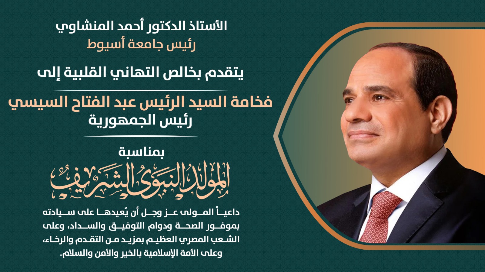 هنأ الدكتور أحمد المنشاوي، رئيس جامعة أسيوط، فخامة السيد الرئيس عبد الفتاح السيسي، رئيس الجمهورية، في برقية رسمية بمناسبة حلول ذكرى المولد النبوي الشريف، داعيًا الله عز وجل أن يُعيدها على سيادته بموفور الصحة ودوام التوفيق والسداد.
