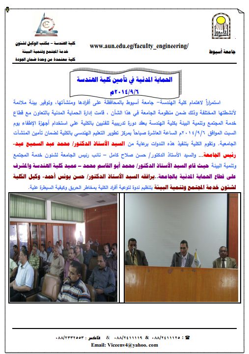 استمرارً لاهتمام كلية الهندسة- جامعة أسيوط بالمحافظة على أفرادها ومنشآتها، وتوفير بيئة ملائمة لأنشطتها المختلفة وذلك ضمن منظومة الجامعة في هذا الشأن ، قامت إدارة الحماية المدنية بالتعاون مع قطاع خدمة المجتمع وتنمية البيئة بكلية الهندسة بعقد دورة تدريبية للفنيين بالكلية علي استخدام أجهزة الإطفاء يوم السبت الموافق 6/9/2014م الساعة العاشرة صباحاً بمركز تطوير التعليم الهندسي بالكلية لضمان تأمين المنشآت الجامعية. وتقوم الكلية بتنفيذ هذه الندوات برعاية من السيد الأستاذ الدكتور/ محمد عبد السميع عيد -رئيس الجامعة... والسيد الأستاذ الدكتور/ حسن صلاح كامل – نائب رئيس الجامعة لشئون خدمة المجتمع وتنمية البيئة حيث قام السيد الأستاذ الدكتور/ محمد أبو القاسم محمد – عميد كلية الهندسة والمشرف على قطاع الحماية المدنية بالجامعة..يرافقه السيد الأستاذ الدكتور/ حسن يونس أحمد- وكيل الكلية لشئون خدمة المجتمع وتنمية البيئة بتنظيم ندوة لتوعية أفراد الكلية بمخاطر الحريق وكيفية السيطرة علية.