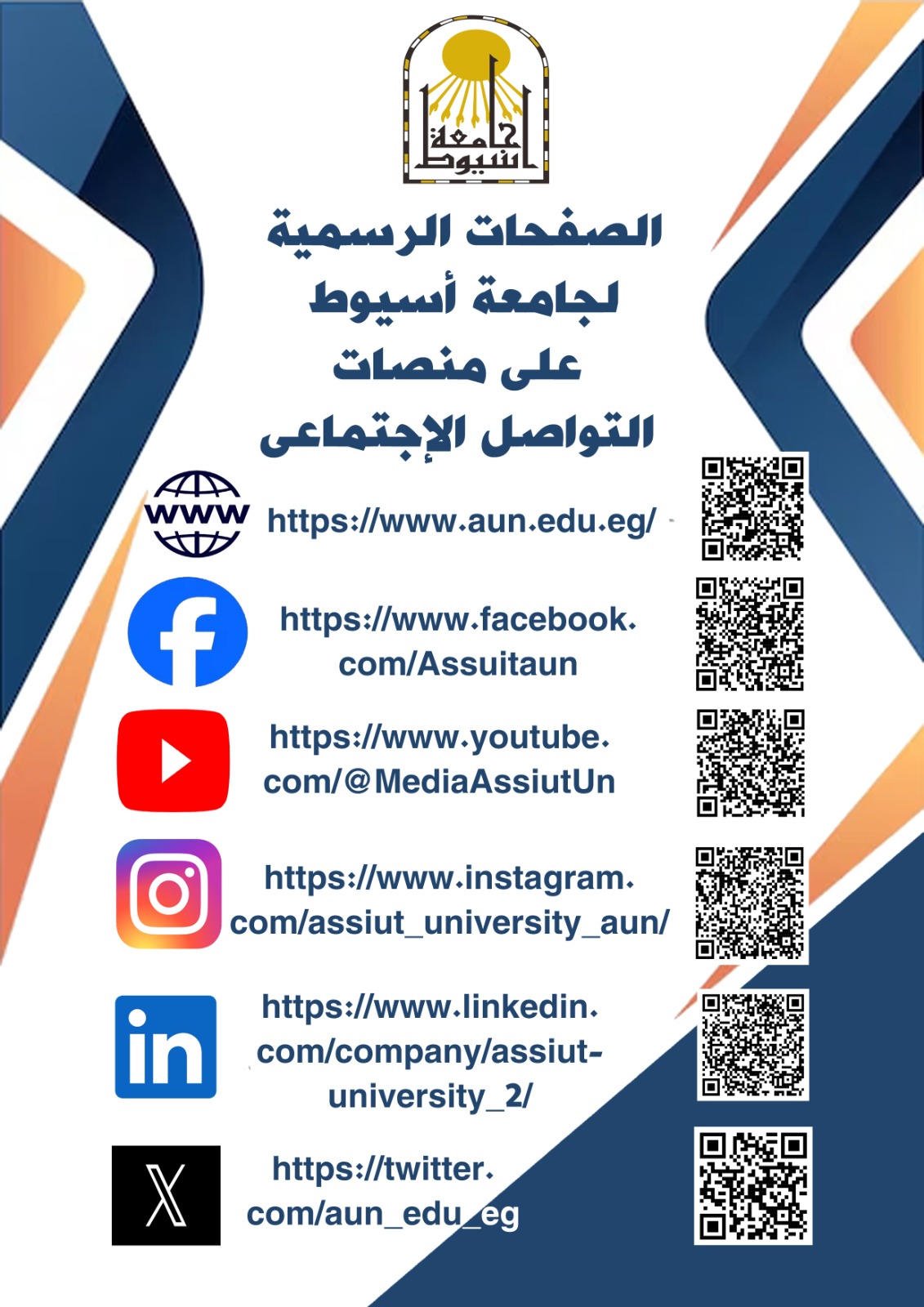روابط الصفحات الرسمية لجامعة أسيوط على مواقع التواصل الاجتماعي ، كالتالي: