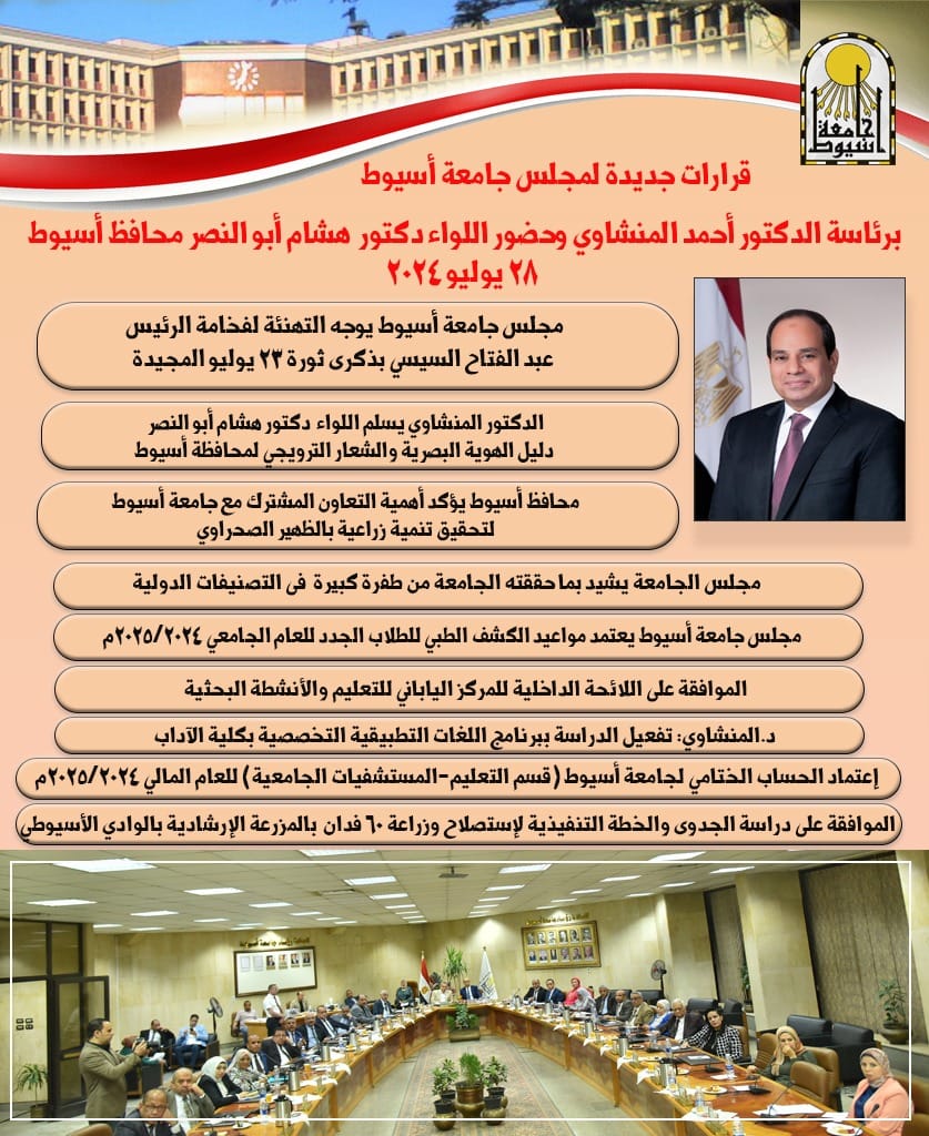 بالانفوجراف .. أبرز قرارات اجتماع مجلس جامعة أسيوط خلال انعقاده، يوم الأحد ٢٨ يوليو ٢٠٢٤، برئاسة الدكتور أحمد المنشاوي رئيس جامعة أسيوط، وحضور اللواء دكتور هشام أبو النصر محافظ أسيوط.