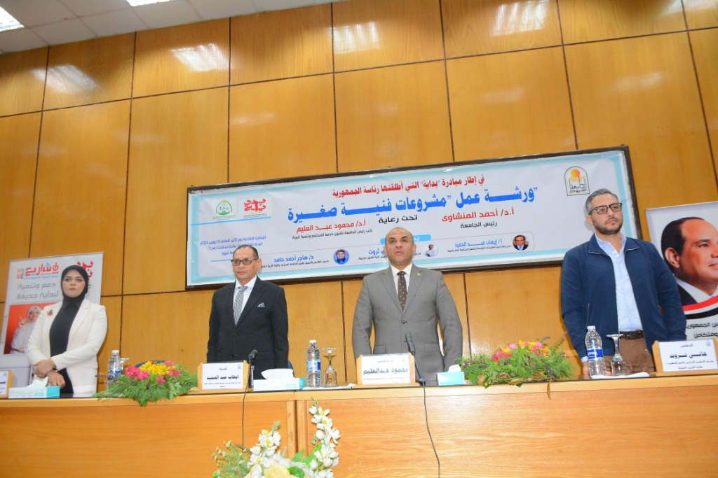 تحت رعاية الدكتور أحمد المنشاوى رئيس جامعة أسيوط؛ نظّم قطاع خدمة المجتمع وتنمية البيئة، بالجامعة؛ ورشة عمل، بعنوان: "مشروعات فنية صغيرة"، ضمن المبادرة الرئاسية "بداية جديدة لبناء الإنسان"، وذلك تحت إشراف: الدكتور محمود عبدالعليم نائب رئيس الجامعة لشئون خدمة المجتمع وتنمية البيئة، والدكتور خالد صلاح عميد كلية الفنون الجميلة، والدكتورة إيناس ضاحي أحمد أستاذ التصوير بقسم التربية الفنية، بكلية التربية النوعية، ومنسق الورشة، وذلك بقاعة المناقشات، بالمبني الإداري بالجامعة