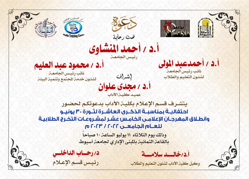 أعلن الدكتور أحمد المنشاوي رئيس جامعة أسيوط، انطلاق فاعليات المهرجان الإعلامي الخامس عشر لمشروعات التخرج الطلابية للعام الجامعي 2022/2023، وذلك بحضور اللواء عصام سعد محافظ أسيوط، والدكتور أحمد عبد المولى نائب رئيس الجامعة لشئون التعليم والطلاب، والدكتور محمود عبد العليم نائب رئيس الجامعة لشئون خدمة المجتمع وتنمية البيئة، وبإشراف الدكتور مجدي علوان عميد كلية الآداب، والدكتور خالد سلامة وكيل الكلية لشؤون التعليم والطلاب، والدكتورة رحاب الداخلي رئيس قسم الإعلام.