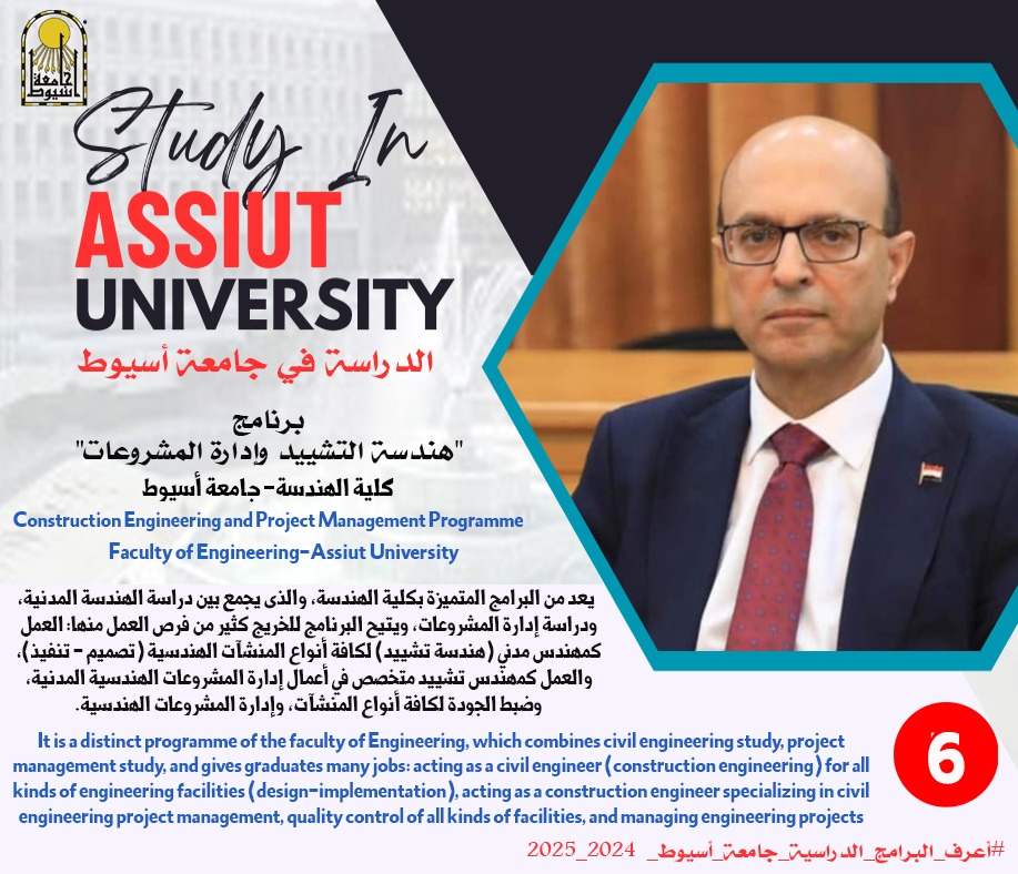 ?تقدم كلية الهندسة؛ برنامج :"هندسة التشييد وإدارة المشروعات" بنظام الساعات المعتمدة، ويجمع البرنامج بين دراسة الهندسة المدنية، ودراسة إدارة المشروعات، تحت إشراف: الدكنور أحمد عبد المولى نائب رئيس الجامعة لشئون التعليم والطلاب، والدكتور عزت مرغني عميد كلية الهندسة، والدكتور وليد أبوالوفا الأستاذ بقسم الهندسة المدنية.