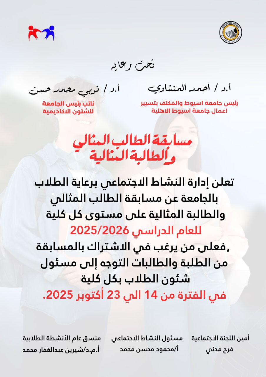 تحت رعاية الدكتور أحمد المنشاوي، رئيس جامعة أسيوط والمكلف بتسيير أعمال جامعة أسيوط الأهلية، تعلن إدارة النشاط الاجتماعي بالجامعة عن انطلاق مسابقة "الطالب المثالي والطالبة المثالية" على مستوى جميع الكليات للعام الدراسي 2025/2026، وذلك تحت إشراف الدكتور نوبي محمد حسن، نائب رئيس الجامعة للشئون الأكاديمية، والدكتورة شيرين عبدالغفار محمد، منسق عام الأنشطة الطلابية، والأستاذ محمود محسن، مسؤول النشاط الاجتماعي.