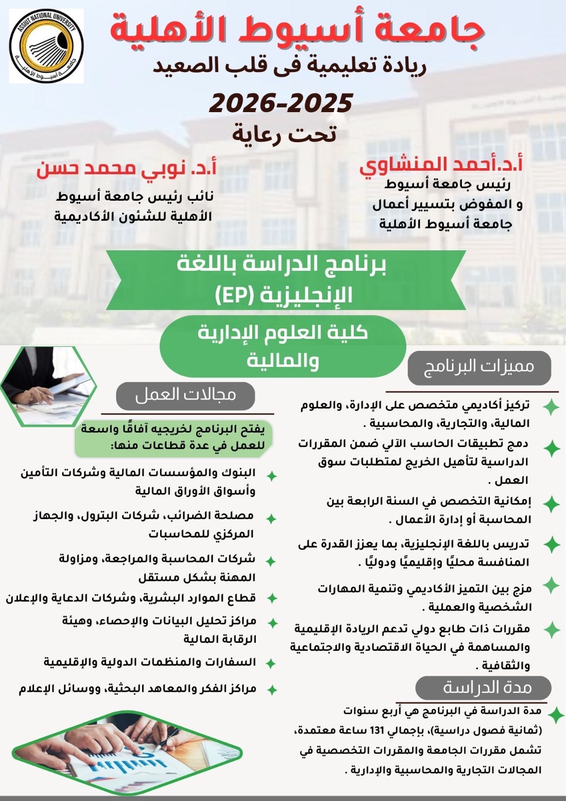 جامعة أسيوط الأهلية تطلق برنامج «الدراسة باللغة الإنجليزية (EP)» بكلية العلوم الإدارية والمالية للعام الجامعي 2025/2026