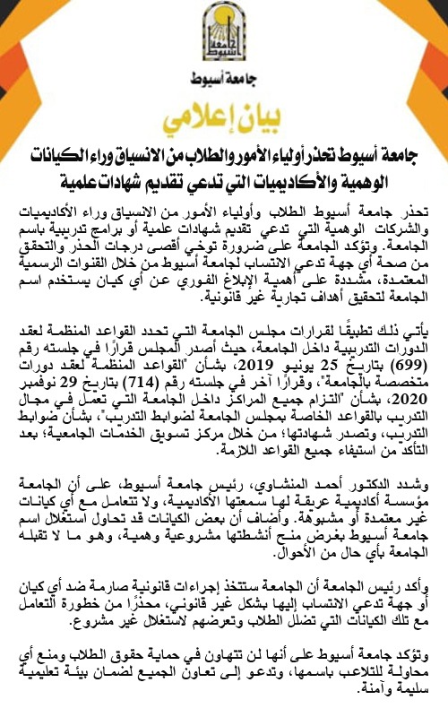 ? جامعة أسيوط تحذر أولياء الأمور والطلاب من الانسياق وراء الكيانات الوهمية والأكاديميات التي تدعي تقديم شهادات علمية 12 أبريل 2025 ? جامعة أسيوط تحذر أولياء الأمور والطلاب من الانسياق وراء الكيانات الوهمية والأكاديميات التي تدعي تقديم شهادات علمية