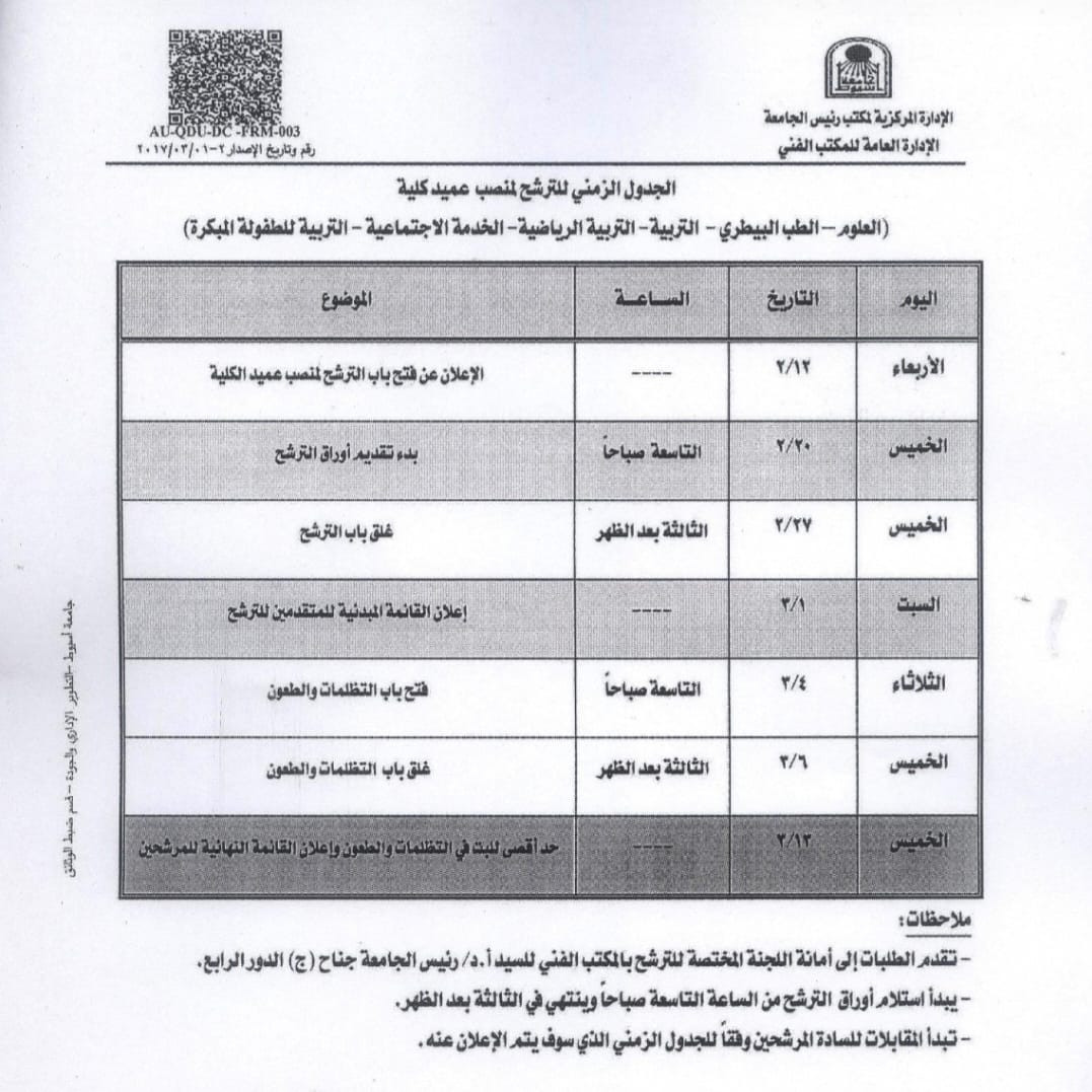 أعلنت اللجنة المختصة بترشيح عمداء جامعة أسيوط، برئاسة الدكتور أحمد المنشاوي، رئيس الجامعة، اليوم السبت 1 من مارس، القائمة المبدئية للمتقدمين للترشح لشغل منصب عميد لعدد (6) كليات بالجامعة، وهي: العلوم، الطب البيطري، التربية، التربية الرياضية، الخدمة الاجتماعية، والتربية للطفولة المبكرة.