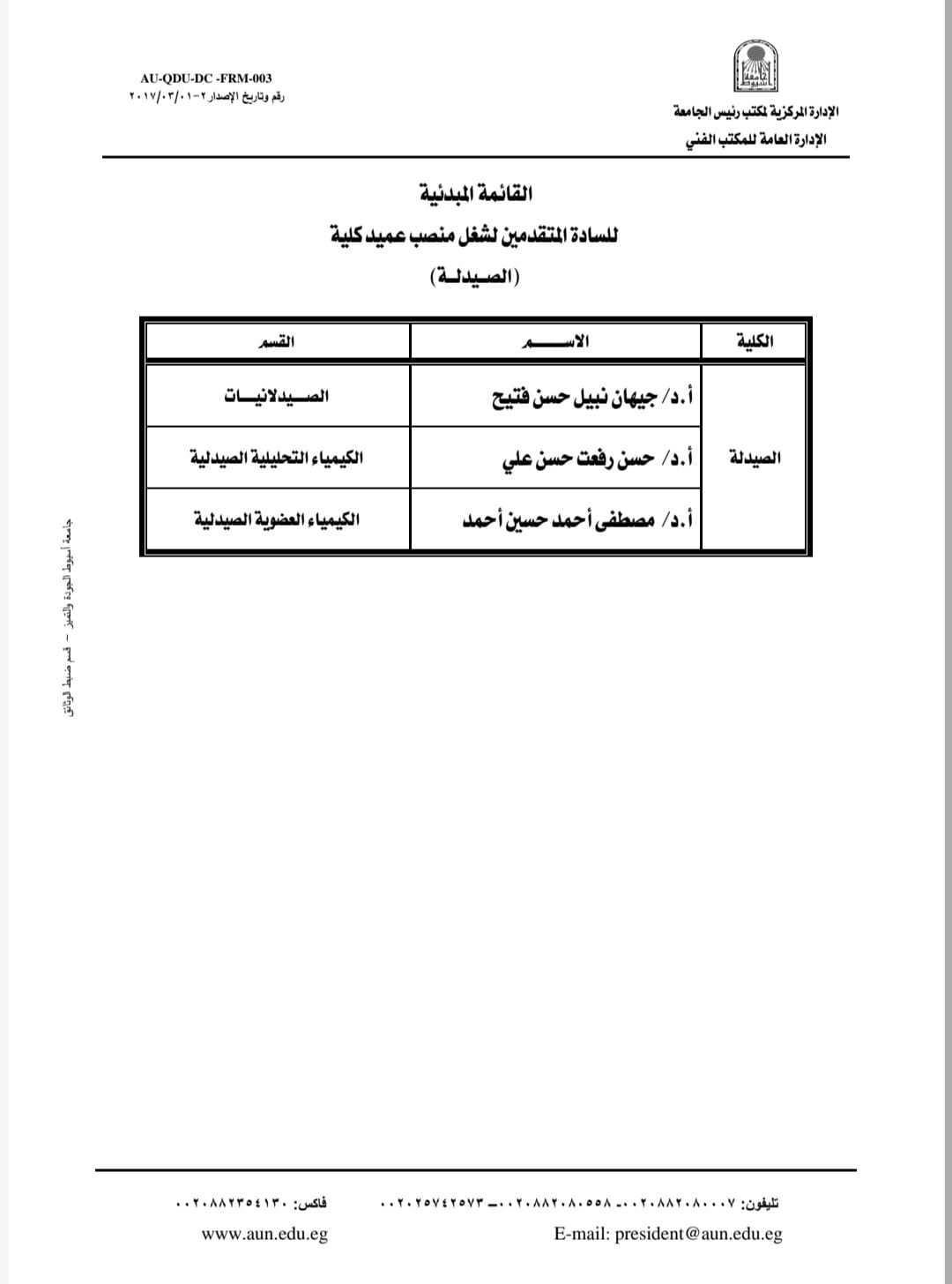 وتضم القائمة المبدئية لشغل منصب عميد كلية الصيدلة كلًا من: الدكتورة جيهان نبيل حسن فتيح الأستاذ بقسم الصيدلانيات والقائم بعمل عميد الكلية، والدكتور حسن رفعت حسن على الأستاذ بقسم الكيمياء التحليلية الصيدلية ووكيل الكلية لشئون التعليم والطلاب، والدكتور مصطفى أحمد حسين الأستاذ بقسم الكيمياء العضوية الصيدلية.