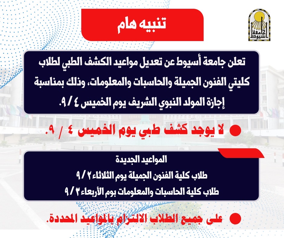 جامعة أسيوط تعلن تعديل مواعيد الكشف الطبي لطلاب كليتي الفنون الجميلة والحاسبات والمعلومات بمناسبة إجازة المولد النبوي