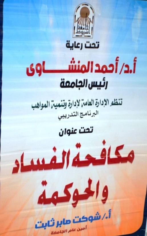برعاية الدكتور أحمد المنشاوي رئيس جامعة أسيوط؛ نظّمت الإدارة العامة لإدارة وتنمية المواهب؛ فعاليات البرنامج التدريبي بعنوان: "مكافحة الفساد، والحوكمة"، بإشراف الأستاذ شوكت صابر أمين عام الجامعة، والأستاذ خالد عمران مدير عام الإدارة العامة لإدارة وتنمية المواهب، وبمشاركة نحو (٥٥) من العاملين بالإدارات المختلفة في المبنى الإداري، وكليات الجامعة، والمستشفيات الجامعية، وذلك بقاعة المناقشات بالدور الأول بالمبنى الإداري بالجامعة .
