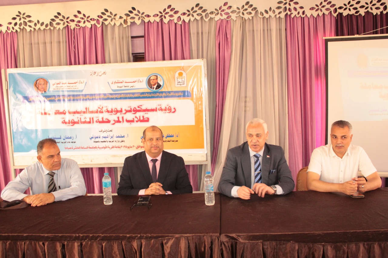 وجاءت الندوة بإشراف الدكتور أحمد عبد المولى، نائب رئيس الجامعة لشؤون التعليم والطلاب ورئيس مجلس إدارة الوحدة، والدكتور مصطفى عبد المحسن الحديبي، مدير الوحدة، وبمشاركة الأستاذ محمد إبراهيم الدسوقي، وكيل وزارة التربية والتعليم بأسيوط، وأكثر من 100 أخصائي نفسي وموجّه من مختلف الإدارات التعليمية بالمحافظة.