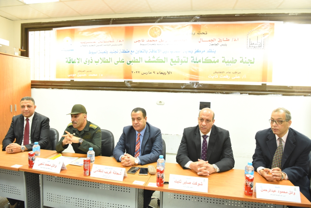 كشف الدكتور طارق الجمال رئيس جامعة أسيوط عن انعقاد اليوم الأربعاء 9 مارس اللجنة الطبية المتكاملة لتوقيع الكشف الطبي على الطلاب من ذوى الهمم ، والتي نظمها مركز رعاية الطلاب ذوى الهمم بالتعاون مع منطقة تجنيد و تعبئة أسيوط ، وذلك بحضور الدكتور شحاتة غريب نائب رئيس الجامعة لشئون التعليم والطلاب ورئيس مجلس إدارة المركز ، والعميد وائل محمد ناجى مدير منطقة تجنيد وتعبئة أسيوط، والدكتور محمد حسين موسى مدير المركز، والنقيب محمد عبده رئيس فرع التجنيد، و أعضاء اللجنة الطبية برئاسة الرائد عمرو جمال ، والنقيب محمد عاطف ، والنقيب مصطفى كامل ،والأستاذ شوكت صابر أمين عام الجامعة ، والأستاذ وائل محمود أمين عام الجامعة المساعد والأستاذ هاني رفعت مفتش عام التجنيد ، والأستاذ إسلام ناصر مدير مكتب التأجيلات الدراسية.