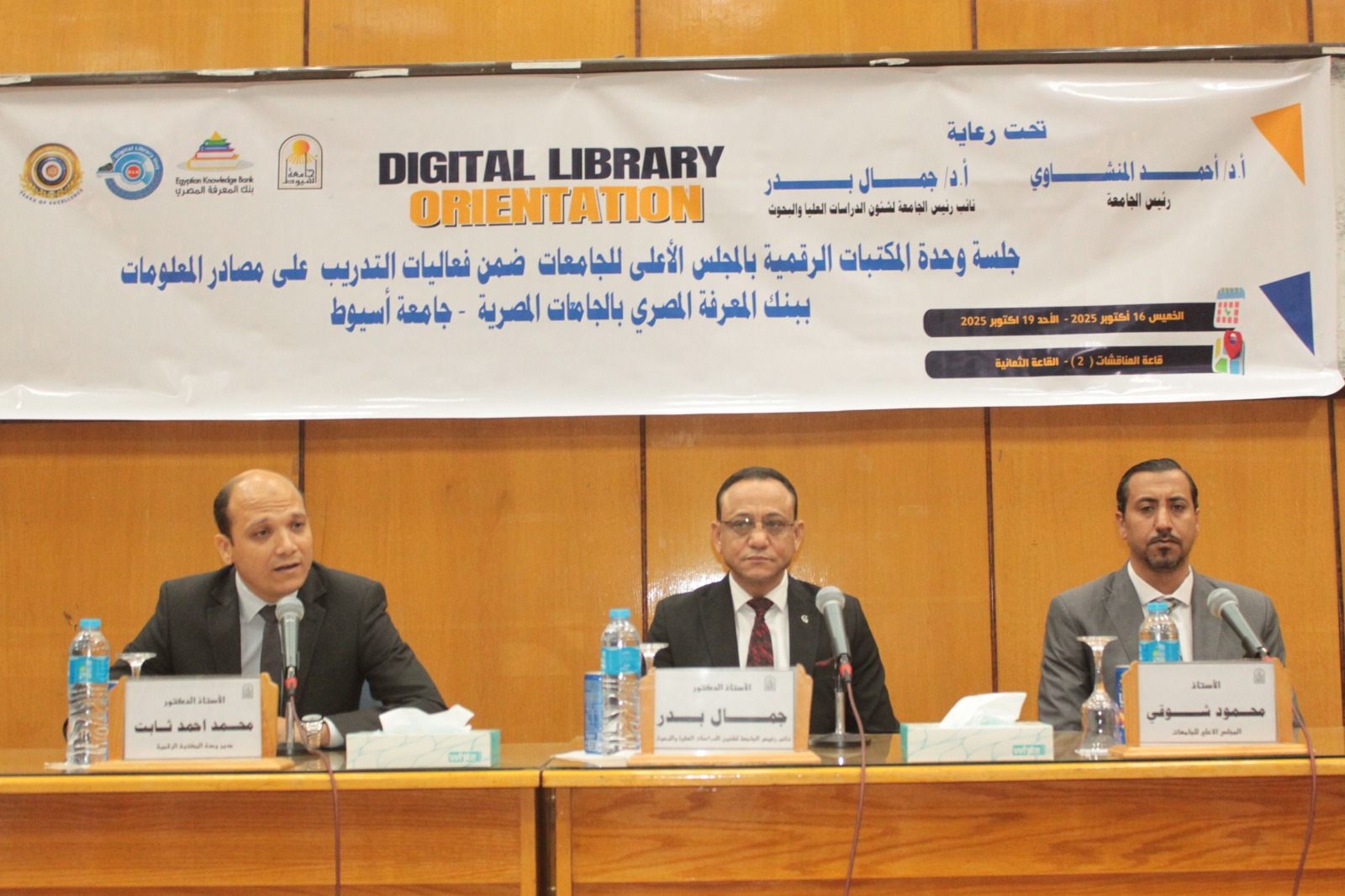 تحت رعاية الدكتور أحمد المنشاوي، رئيس جامعة أسيوط، نظم قطاع الدراسات العليا والبحوث بالجامعة جلسة وحدة المكتبات الرقمية بالمجلس الأعلى للجامعات، ضمن فعاليات التدريب على مصادر المعلومات ببنك المعرفة المصري بالجامعات المصرية، والتي تُعقد في الفترة من الخميس 16 أكتوبر حتى الأحد 19 أكتوبر 2025، بجامعة أسيوط.