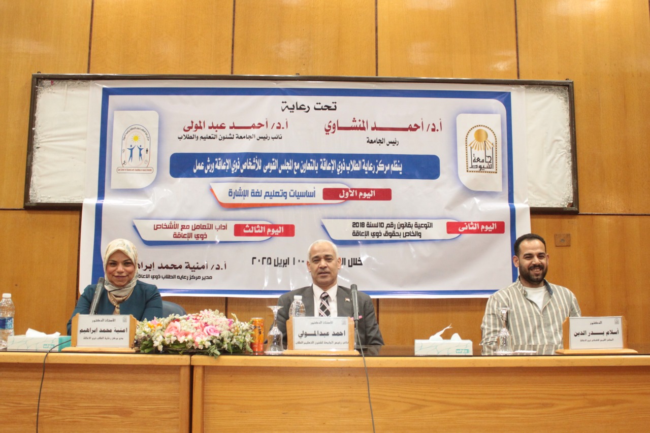 أكد الدكتور أحمد المنشاوي أهمية التعاون المستمر مع المجلس القومي للأشخاص ذوي الإعاقة، مشيداً بالورش في نشر الوعي بحقوق ذوي الإعاقة، وتطوير مهارات مقدمي الخدمات التعليمية والطلابية داخل الجامعة. وأوضح أن الورش تشمل محاور رئيسية، هي: أساسيات لغة الإشارة، والتوعية بقانون رقم 10 لسنة 2018 الخاص بحقوق الأشخاص ذوي الإعاقة، بالإضافة إلى التعريف بآداب وسلوكيات التعامل مع الأشخاص ذوي الإعاقة.