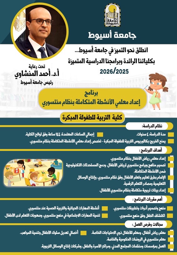 تحت رعاية الدكتور أحمد المنشاوي رئيس الجامعة، أعلنت كلية التربية للطفولة المبكرة بجامعة أسيوط عن إطلاق برنامج أكاديمي لإعداد معلمي الأنشطة المتكاملة بنظام منتسوري، وذلك تحت إشراف الدكتور أحمد عبد المولى نائب رئيس الجامعة لشئون التعليم والطلاب، والدكتورة يارا إبراهيم عميدة الكلية، والدكتورة غادة كامل وكيلة الكلية لشئون التعليم والطلاب، والدكتورة رانيا محمد نبيل منسق البرنامج.