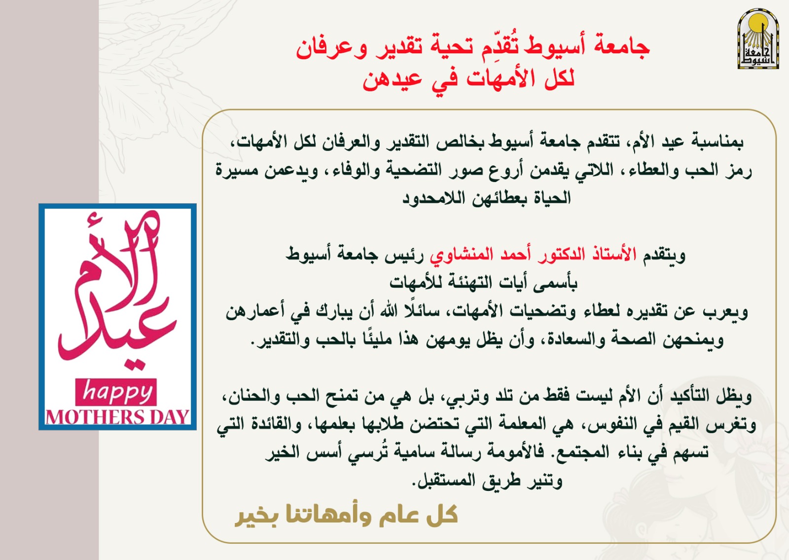بمناسبة عيد الأم، تتقدم جامعة أسيوط بخالص التقدير والعرفان لكل الأمهات، رمز الحب والعطاء، اللاتي يقدمن أروع صور التضحية والوفاء، ويدعمن مسيرة الحياة بعطائهن اللامحدود. فبجهودهن تنشأ الأجيال، ويُبنى المستقبل المشرق للوطن.