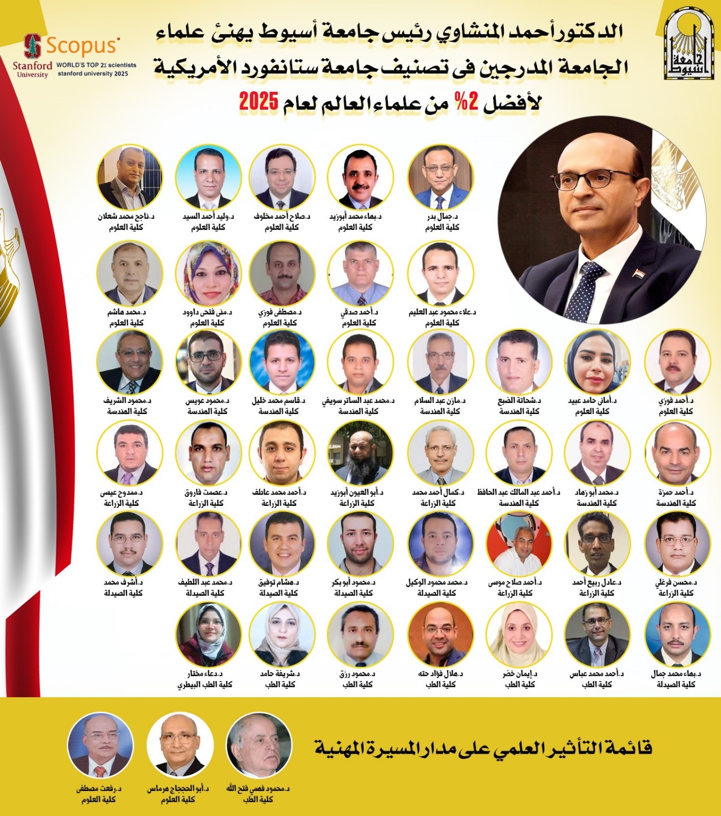 في إنجاز علمي جديد يضاف إلى رصيد جامعة أسيوط، أعلن الدكتور أحمد المنشاوي، رئيس الجامعة، إدراج (44) عالماً من أساتذتها ضمن قائمة جامعة ستانفورد الأمريكية لأفضل 2% من علماء العالم الأكثر تأثيرًا لعام 2025، وذلك استنادًا إلى حجم إنتاجهم العلمي والاستشهادات المرجعية بأبحاثهم المنشورة في مختلف التخصصات.