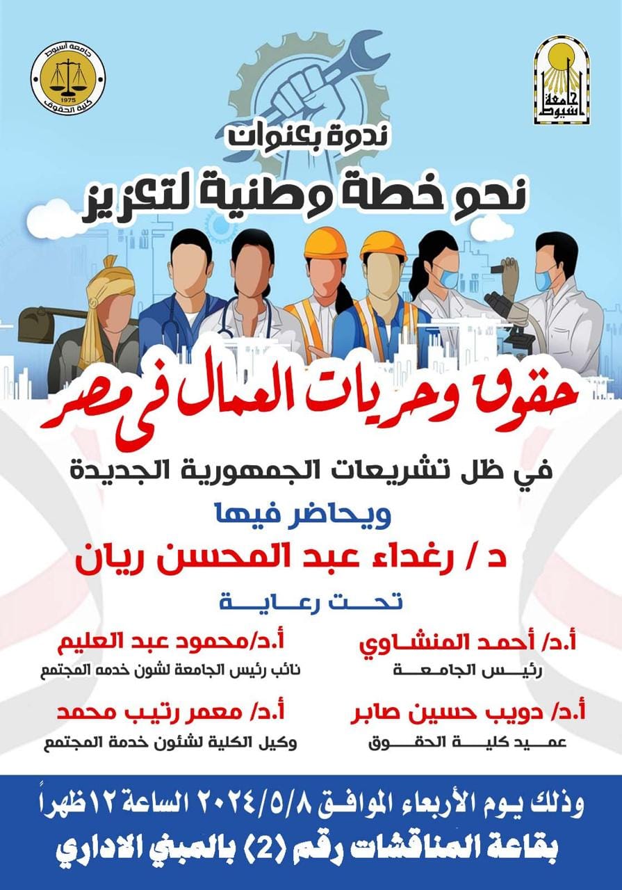 تنظم كلية الحقوق بجامعة أسيوط، تحت رعاية الدكتور أحمد المنشاوي رئيس الجامعة، ندوة بعنوان: "نحو خطة وطنية؛ لتعزيز حقوق، وحريات العمال في مصر"؛ في ظل تشريعات الجمهورية الجديدة، يوم الأربعاء الموافق ٨ من مايو الساعة ١٢ ظهراً، بقاعة المناقشات (٢) بالمبنى الإداري.
