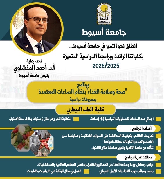 كلية الطب البيطري بجامعة أسيوط تقدم "برنامج صحة وسلامة الغذاء" بنظام الساعات المعتمدة للعام الجامعي 2025/2026