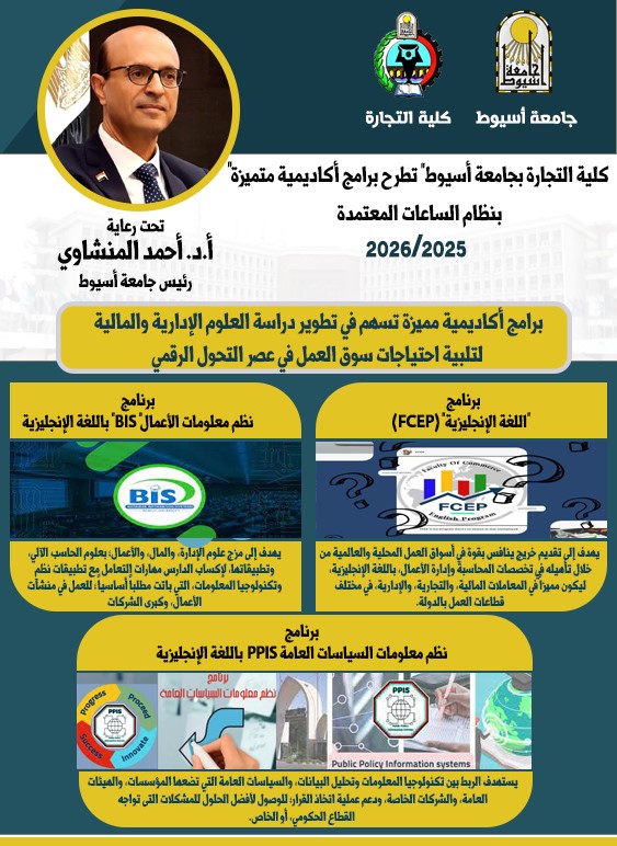 - برنامج نظم معلومات الأعمال (BIS): انطلق عام 2020، وتُعد جامعة أسيوط ثالث جامعة حكومية تطرحه، حيث يجمع بين علوم الإدارة والمال والأعمال وتطبيقات الحاسب الآلي، لإكساب الطلاب مهارات التعامل مع نظم وتكنولوجيا المعلومات المطلوبة في كبرى المؤسسات والشركات.