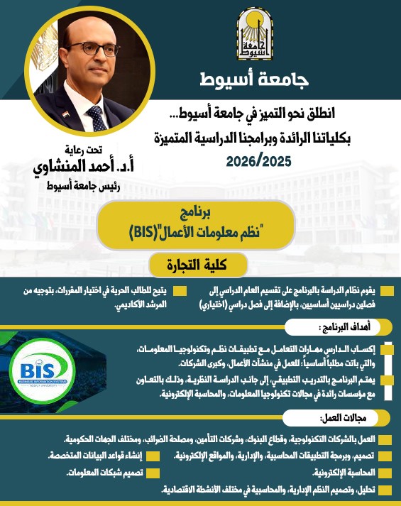 وفي هذا السياق، تقدم كلية التجارة برنامج نظم معلومات الأعمال BIS باللغة الإنجليزية، بنظام الساعات المعتمدة، لتكون جامعة أسيوط ثالث جامعة حكومية على مستوى الجمهورية تقدم هذا التخصص المتميز الذي يجمع بين علوم الإدارة والمال والأعمال من جهة، وعلوم الحاسب الآلي وتطبيقاته من جهة أخرى.