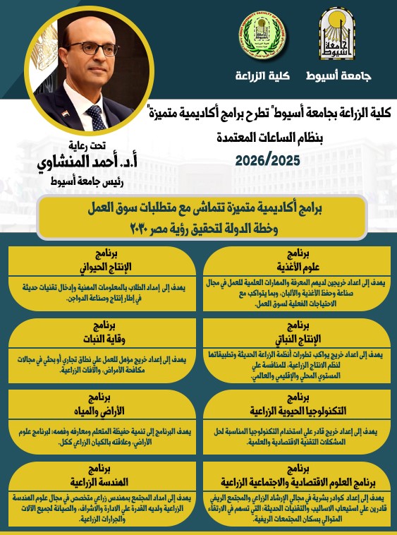 وفي هذا السياق، صرّح الدكتور أحمد المنشاوي، رئيس جامعة أسيوط، أن طرح كلية الزراعة لهذه البرامج الدراسية بنظام الساعات المعتمدة يأتي في إطار حرص الجامعة على تطوير منظومتها التعليمية بما يواكب متغيرات العصر، ويسهم في إعداد خريج متميز قادر على المنافسة في سوق العمل المحلي والإقليمي والدولي. وأكد أن الجامعة تولي اهتمامًا خاصًا بالبرامج الأكاديمية التي تدعم مجالات الزراعة والبحث العلمي، نظرًا لما تمثله من أهمية في تحقيق الأمن الغذائي ودعم خطط الدولة للتنمية المستدامة ورؤية مصر 2030، مؤكدًا على أن هذه البرامج تسهم في تخريج كوادر علمية مؤهلة قادرة على خدمة المجتمع وتحقيق التنمية الشاملة.