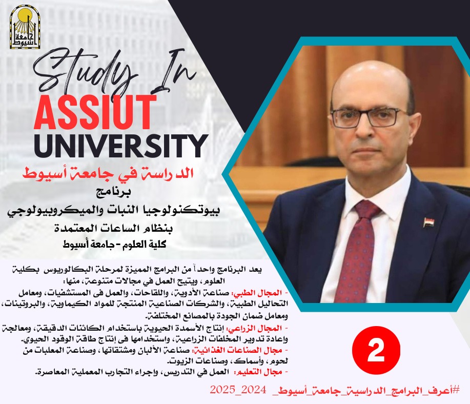 ?تقدم كلية العلوم بجامعة أسيوط؛ برنامج "بيوتكنولوجيا النبات والميكروبيولوجي"؛ والذي يعد واحداً من البرامج المميزة لمرحلة البكالوريوس، ويهدف إلى تقديم حلول تعتمد على بيوتكنولوجي النبات والميكروبيولوجي؛ للقضايا المتعلقة بالتنمية في القطاعات الصناعية، والزراعية، والبيئية.