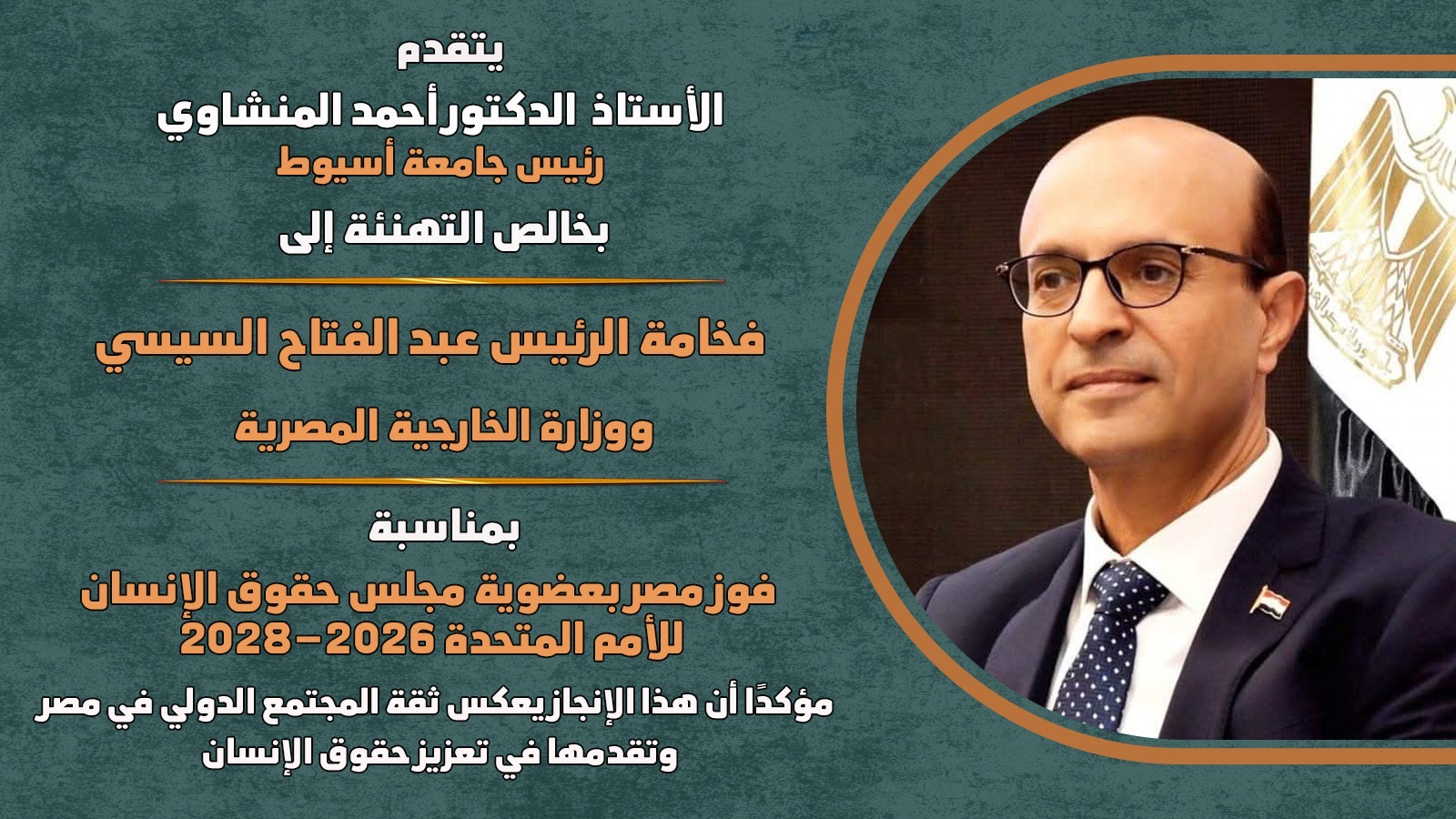 يتقدم الدكتور أحمد المنشاوي، رئيس جامعة أسيوط، بخالص التهنئة لفخامة الرئيس عبد الفتاح السيسي ووزارة الخارجية المصرية، بمناسبة فوز مصر بعضوية مجلس حقوق الإنسان التابع للأمم المتحدة للفترة 2026–2028، مؤكدًا أن هذا الإنجاز يعكس ثقة المجتمع الدولي في مكانة مصر ودورها الرائد في تعزيز حقوق الإنسان.
