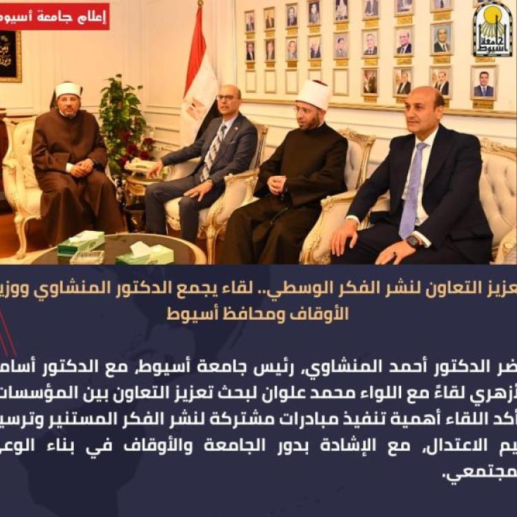 شهد الدكتور أحمد المنشاوي، رئيس جامعة أسيوط، برفقة الدكتور أسامة الأزهري، وزير الأوقاف، لقاءً مع اللواء محمد علوان محافظ أسيوط