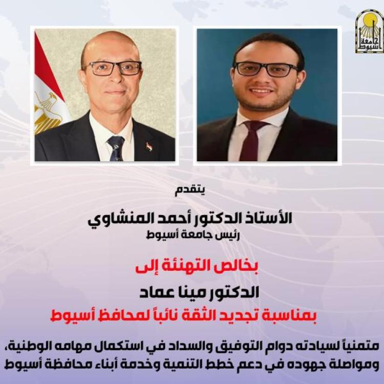 الدكتور أحمد المنشاوي يهنئ الدكتور مينا عماد بتجديد الثقة نائبًا لمحافظ أسيوط
