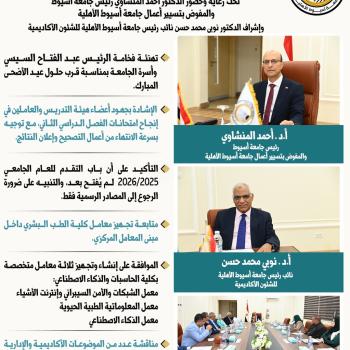 تحت رعاية الدكتور أحمد المنشاوي رئيس جامعة أسيوط، عقدت اللجنة التنفيذية لمركز التنمية المستدامة بالجامعة اجتماعًا لمتابعة خطة العمل وتنفيذ الأهداف الاستراتيجية للمركز،…