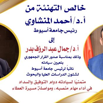 يتقدم الأستاذ الدكتور أحمد المنشاوي، رئيس جامعة أسيوط؛ بخالص التهاني وأطيب التمنيات إلى السيد الأستاذ الدكتور/ جمال جمال عبد الرؤوف بدر، وذلك بمناسبة صدور القرار…
