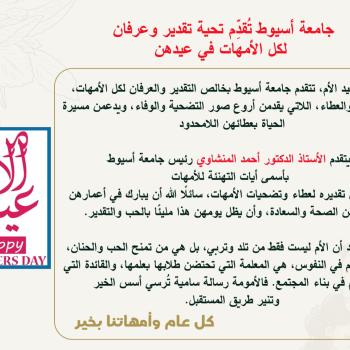 بمناسبة عيد الأم، تتقدم جامعة أسيوط بخالص التقدير والعرفان لكل الأمهات، رمز الحب والعطاء، اللاتي يقدمن أروع صور التضحية والوفاء، ويدعمن مسيرة الحياة بعطائهن اللامحدود.…