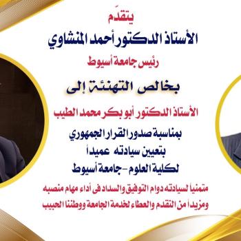 قدّم الدكتور أحمد المنشاوي، رئيس جامعة أسيوط، خالص التهنئة إلى الدكتور أبو بكر محمد…
