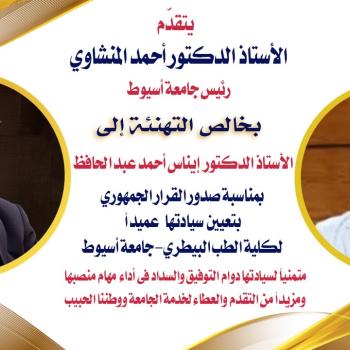 قدّم الدكتور أحمد المنشاوي، رئيس جامعة أسيوط، خالص التهاني إلى الدكتورة إيناس…