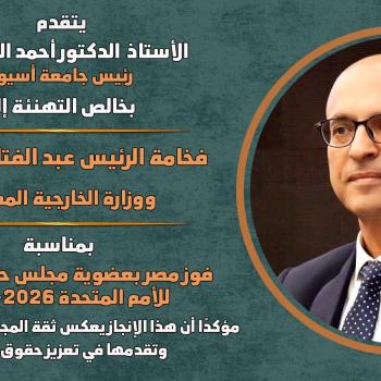 يتقدم الدكتور أحمد المنشاوي، رئيس جامعة أسيوط، بخالص التهنئة لفخامة الرئيس عبد الفتاح السيسي ووزارة…