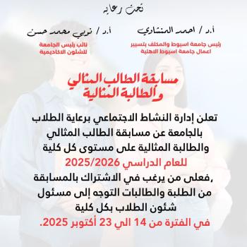 تحت رعاية الدكتور أحمد المنشاوي، رئيس جامعة أسيوط والمكلف بتسيير أعمال جامعة أسيوط الأهلية، تعلن إدارة النشاط الاجتماعي…